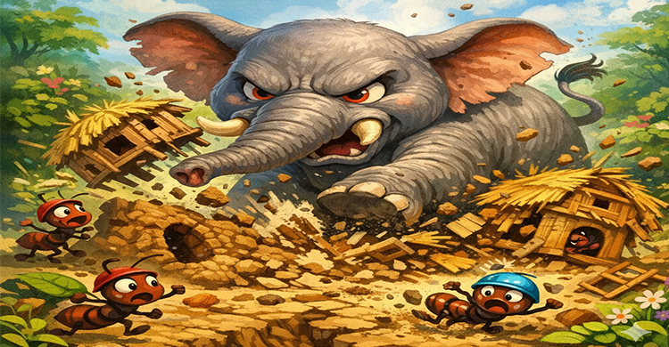 In a faraway jungle lived a huge elephant who loved showing off his strength. He bullied smaller animals and even laughed as he splashed water on a tiny ant family.