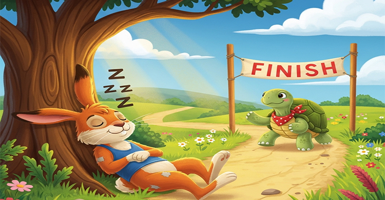 A hare once challenged a slow tortoise to a race. The hare ran quickly but became overconfident and stopped to take a nap. The tortoise moved slowly yet steadily, never stopping. Alas! It was too late for the hare, for by the time he woke up, the tortoise had already crossed the finish line and won the race.