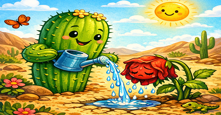 After a severe drought, the rose began to droop. The cactus generously shared water when she asked for help. Apologizing, the rose treated him kindly, and soon they became good friends.
